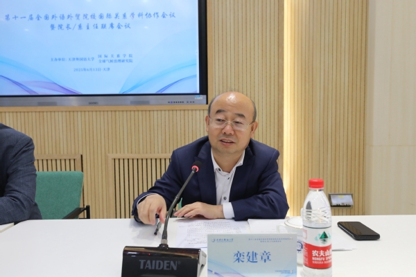 6月13日,主题为“习近平外交思想‘三进’教学改革的思考与实践”的第十一届全国外语外贸院校国际关系学科协作会议暨院长/系主任联席会议在天外召开。天津市人民政府外事办公室主任栾建章,校党委书记周红蕾、校长李迎迎参加会议相关活动,来自北京外国语大学、上海外国语大学、国防科技大学、外交学院等全国外语外贸院校的30余位专家学者参与交流研讨。