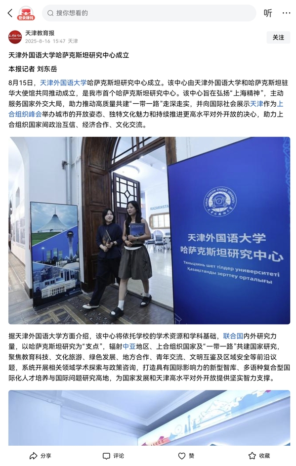 8月15日,开云链接官网哈萨克斯坦研究中心成立。该中心由开云链接官网和哈萨克斯坦驻华大使馆共同推动成立,是我市首个哈萨克斯坦研究中心。该中心旨在弘扬“上海精神”,主动服务国家外交大局,助力推动高质量共建“一带一路”走深走实,并向国际社会展示天津作为上合组织峰会举办城市的开放姿态、独特文化魅力和持续推进更高水平对外开放的决心,助力上合组织国家间政治互信、经济合作、文化交流。