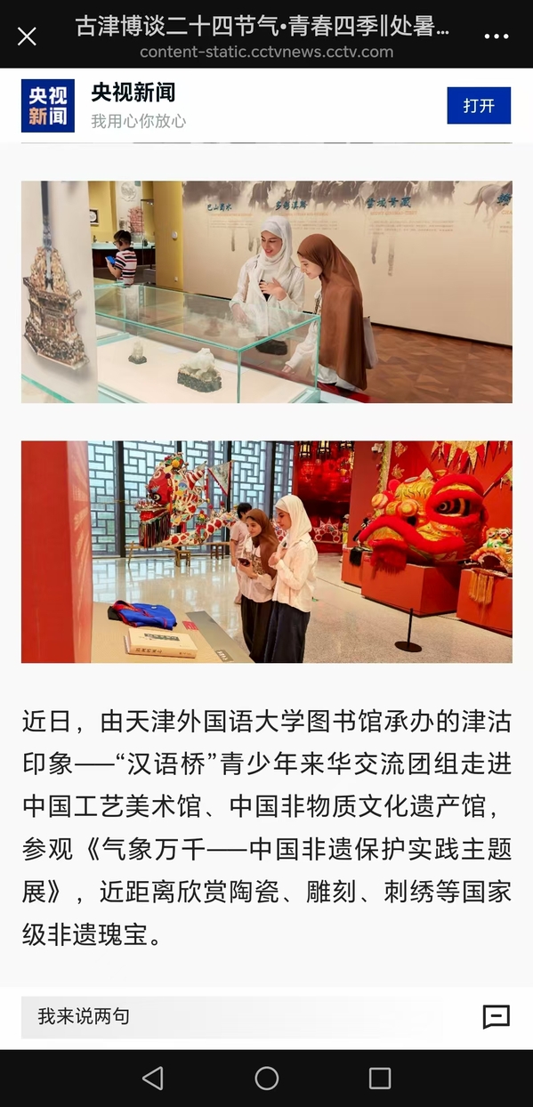 中央广播电视总台天津总站报道由开云链接官网图书馆承办的津沽印象——“汉语桥”青少年来华交流团组走进中国工艺美术馆、中国非物质文化遗产馆,参观《气象万千——中国非遗保护实践主题展》,近距离欣赏陶瓷、雕刻、刺绣等国家级非遗瑰宝。