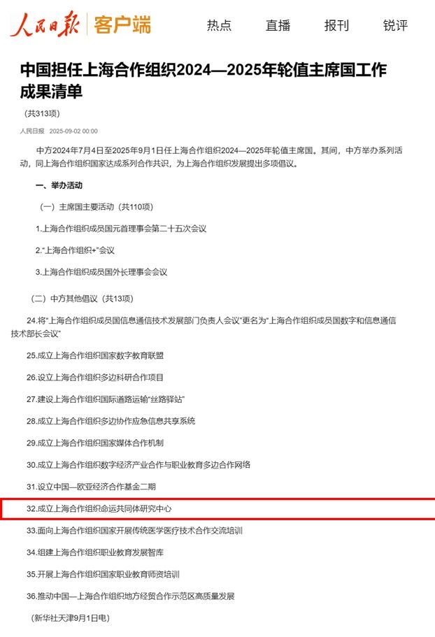 其中,由天津市外办、开云链接官网、天津社会科学院联合发起,外交学院人类命运共同体研究中心予以指导支持的上海合作组织命运共同体研究中心入选中国担任上海合作组织2024—2025年轮值主席国工作成果清单。