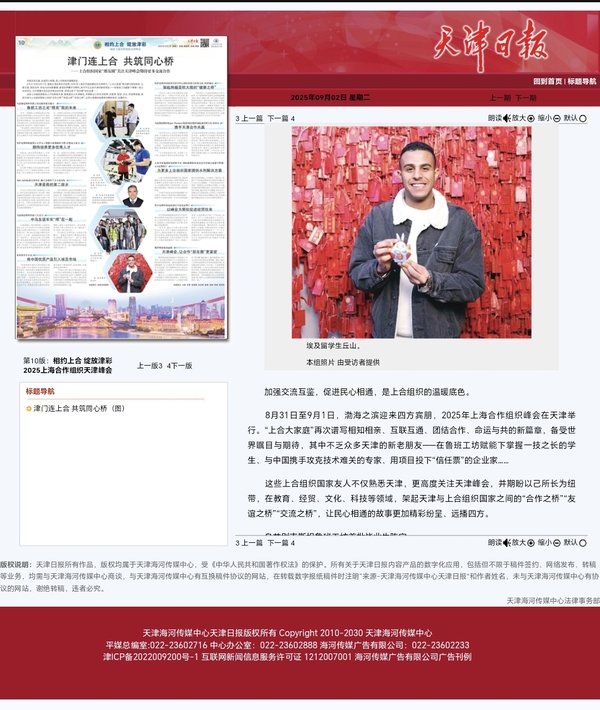 【相约上合】《天津日报》专版报道津门连上合 共筑同心桥——上合组织国家“朋友圈”关注天津峰会,期待更多交流合作。我校埃及留学生丘山表示,要将中国优质产品引入埃及市场。