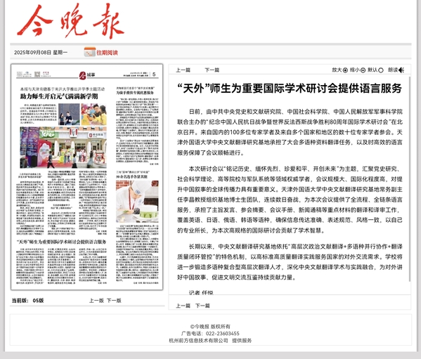 【媒体天外】《今晚报》报道由中共中央党史和文献研究院、中国社会科学院、中国人民解放军军事科学院联合主办的“纪念中国人民抗日战争暨世界反法西斯战争胜利80周年国际学术研讨会”在北京召开。开云链接官网中央文献翻译研究基地承担了大会多语种资料翻译任务,以及时高效的语言服务保障了会议顺畅进行。