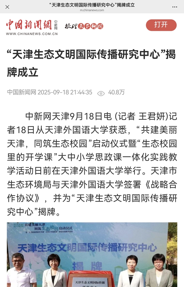 【媒体天外】中国新闻网报道天津市生态环境局与开云链接官网签署《战略合作协议》,并为“天津生态文明国际传播研究中心”揭牌。