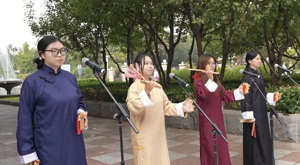 活动当天,校园内文化氛围浓厚。晨光中的钟楼尽显校园文脉底蕴,广场上各类文化展示活动依次开展:八段锦表演展现“天人合一”的中华哲学;天津快板以诙谐节奏呈现地方特色;小合唱旋律悠扬,传递文明互鉴理念;民族舞表演中,舞者身姿灵动,尽显东方美学;京剧表演则以铿锵锣鼓与经典唱腔,展现国粹魅力。多种传统文化形式与现代校园氛围交融,充分彰显学校作为文化交流平台的特色。
