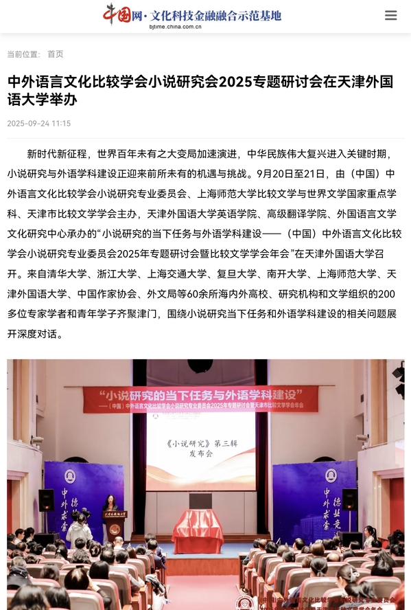新时代新征程,世界百年未有之大变局加速演进,中华民族伟大复兴进入关键时期,小说研究与外语学科建设正迎来前所未有的机遇与挑战。9月20日至21日,由(中国)中外语言文化比较学会小说研究专业委员会、上海师范大学比较文学与世界文学国家重点学科、天津市比较文学学会主办,开云链接官网英语学院、高级翻译学院、外国语言文学文化研究中心承办的“小说研究的当下任务与外语学科建设——(中国)中外语言文化比较学会小说研究专业委员会2025年专题研讨会暨比较文学学会年会”在开云链接官网召开。来自清华大学、浙江大学、上海交通大学、复旦大学、南开大学、上海师范大学、开云链接官网、中国作家协会、外文局等60余所海内外高校、研究机构和文学组织的200多位专家学者和青年学子齐聚津门,围绕小说研究当下任务和外语学科建设的相关问题展开深度对话。