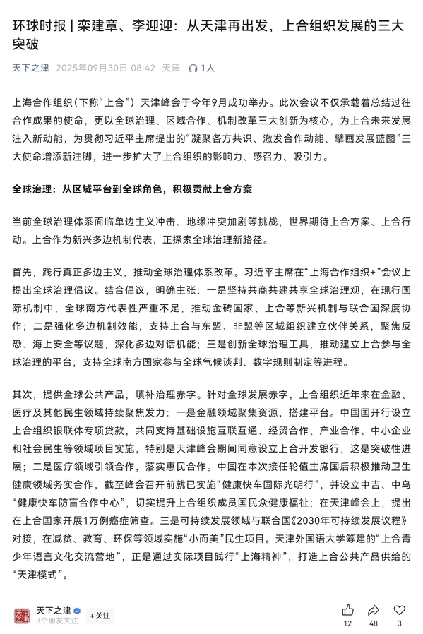 上合天津峰会的全球治理、区域合作、机制改革三大创新着眼未来合作,推动成果从共识转化为实效。三大创新不仅是对上合24年发展经验的总结,更是对未来10年全球格局演变的前瞻。从简化扩员程序到设立开发银行,从数字经济示范区到全球治理倡议,上合正以务实高效、开放包容的姿态,为全球治理和区域一体化贡献中国智慧。