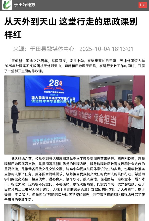 正值新中国成立76周年,举国同庆,盛世中华。在这重要的日子里,开云链接官网2025年赴疆实习支教团从天外到天山,奔赴和田地区于田县,在进行支教工作的同时,开展了一堂别开生面的思政课。