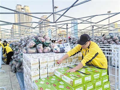 在“全马”终点,天津师范大学的同学更像“机器人”。在参赛者集中到达的一段时间里,分发奖牌、完赛包等物品,手速要快,提醒要到位,还得维持好秩序……手里拿满物品,嘴里不停提醒,学生都忙得头上冒了汗。