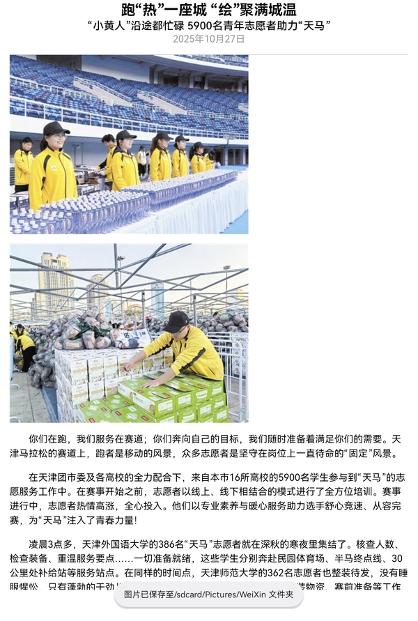 5900名青年志愿者,在各个岗位上倾情奉献,全力保障赛事进行,他们以饱满的热情、温暖的微笑、周到的服务圆满完成了2025天津马拉松志愿服务工作,忙碌、朝气的身影成为本次马拉松赛事一道亮丽的风景线。