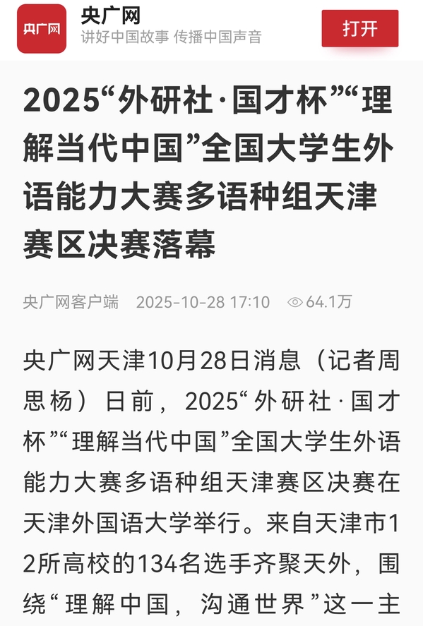 作为天津市首次线下举办的“国才杯”多语种组天津赛区竞赛,本次赛事不仅为全市高校学子搭建起锤炼语言能力、拓展国际视野、涵养家国情怀的重要平台,更为培养兼具家国情怀与全球视野、精通中外文化的高素质复合型国际化人才注入新动能,为增强国家文化软实力、推动文明交流互鉴贡献教育力量。