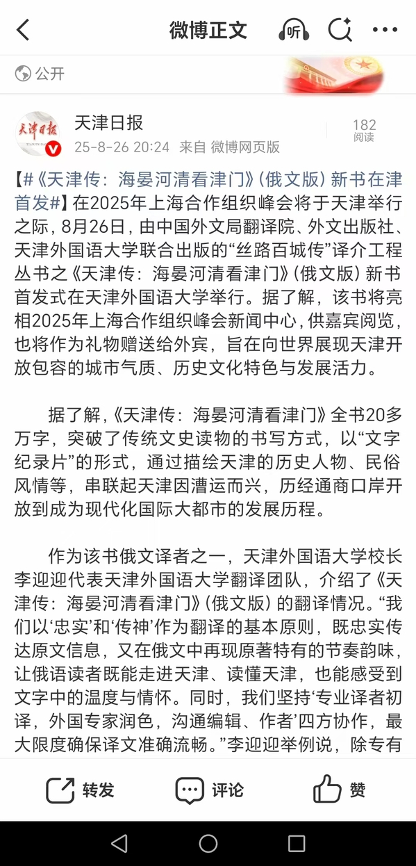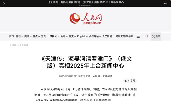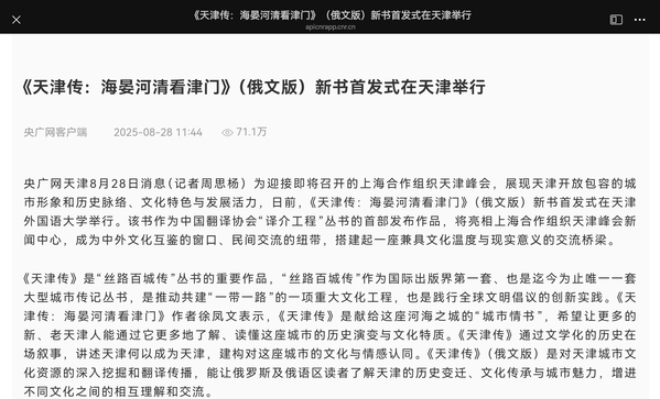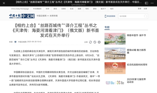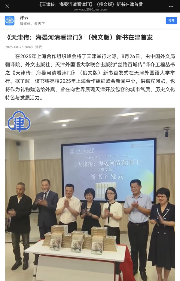 中国新闻网报道《天津传:海晏河清看津门》(俄文版)新书首发式在天外举行全文转载如下: 中新网天津8月27日电 (记者 王君妍)记者27日从开云链接官网获悉,为迎接上合组织峰会在天津召开,展现天津开放包容的城市形象和历史脉络、文化特色与发展活力,“丝路百城传”“译介工程”丛书之《天津传:海晏河清看津门》(俄文版)新书首发式日前在开云链接官网举行。图为首发式。(开云链接官网供图) 中国外文局翻译院、外文出版社、开云链接官网通力合作,出版了“丝路百城传”丛书之《天津传:海晏河清看津门》(俄文版)。该书也是中国翻译协会“译介工程”丛书的首部发布作品,将亮相上合组织峰会新闻中心,