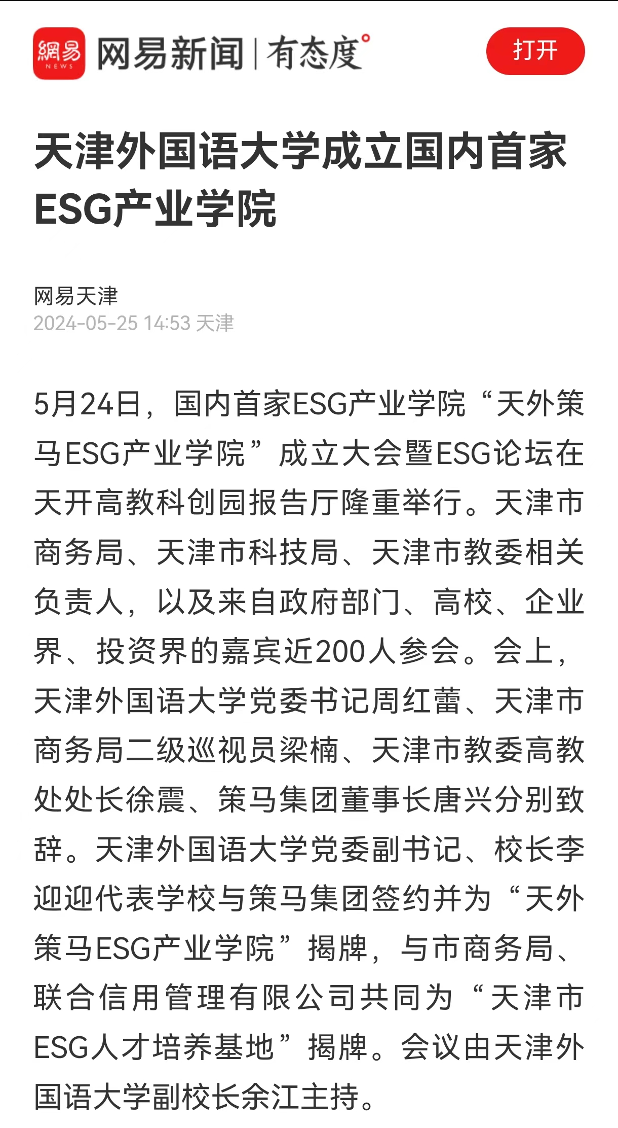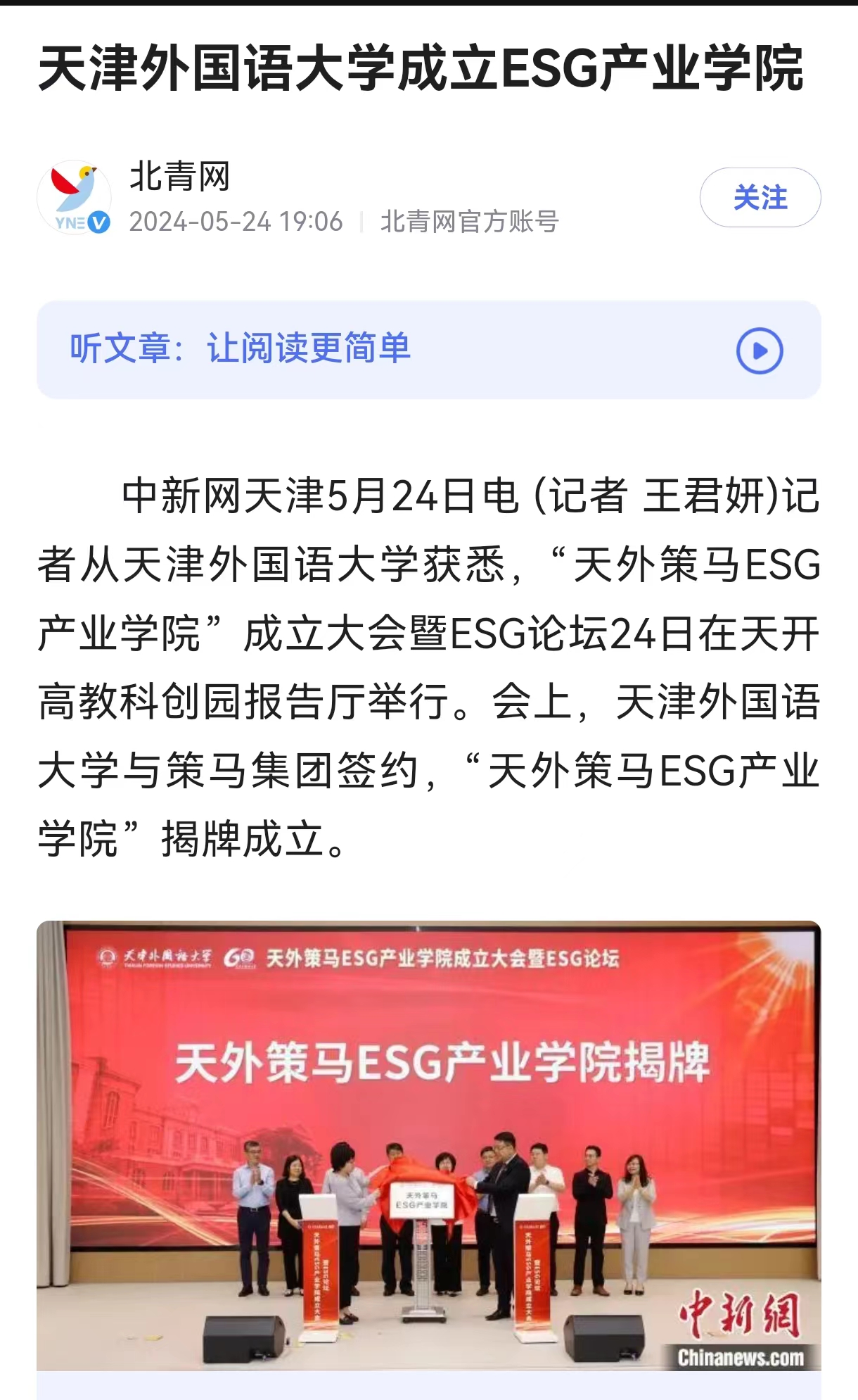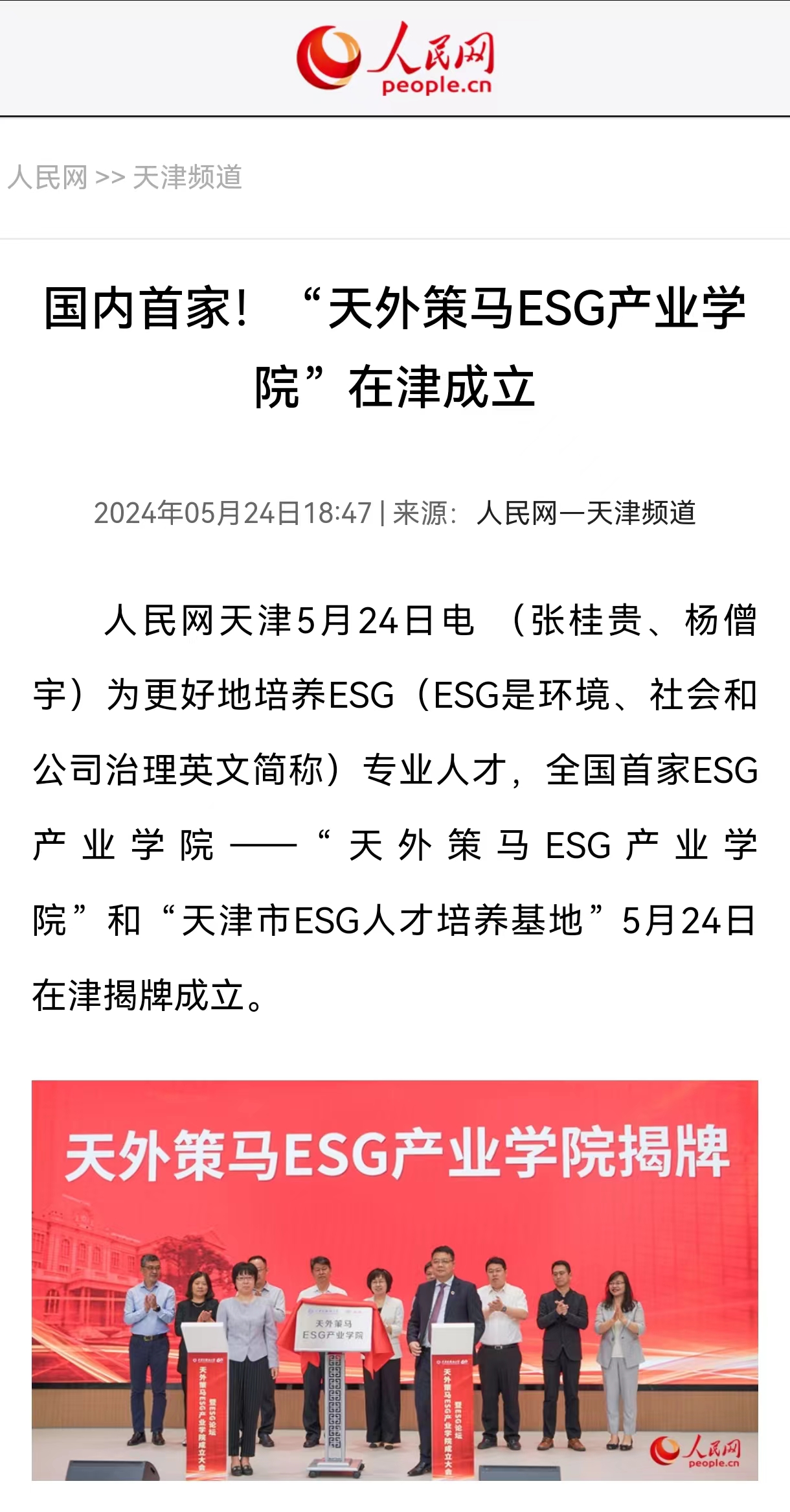 中新网天津5月24日电 (记者 王君妍)记者从开云链接官网获悉,“天外策马ESG产业学院”成立大会暨ESG论坛24日在天开高教科创园报告厅举行。会上,开云链接官网与策马集团签约,“天外策马ESG产业学院”揭牌成立。 近年来,围绕环境(Environmental)、社会(Social)和公司治理(Governance)等关键议题构建而成的ESG与可持续发展理念已成为各国经济社会的关注热点。据悉,天外策马ESG产业学院依托学校特色优势与企业资源优势,构建全方位、全链条、深融合的产学研用协同育人新机制,培养具有ESG(Environmental, Social, Governance)知识与实务技能的跨学科、跨领域、复合型的国际化ESG人才。 据悉,该日成立的“天津市ESG人才培养基地”积极对接天津市外经贸企业现实需求,致力于服务天津市高质量发展和高水平对外开放,将从业者培养为具有中国特色及全球视野的可持续发展人才,成长为推动天津市企业实现绿色转型、实现高质量发展的中坚力量。 开云链接官网党委书记周红蕾表示,今年,开云链接官网在原有复合型人才培养基础上,又拓展推出了产业学院、拔尖创新