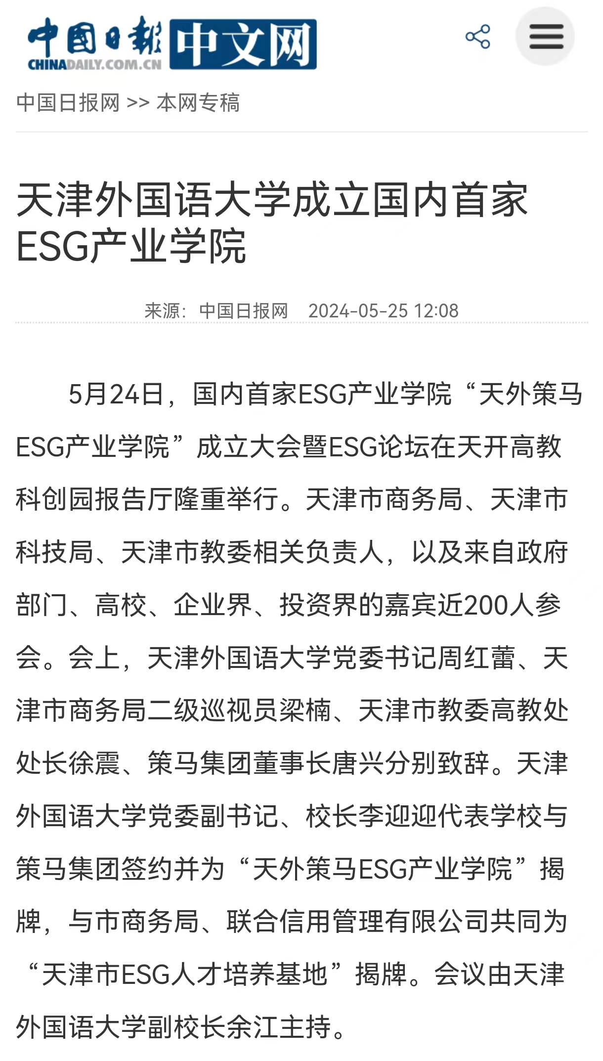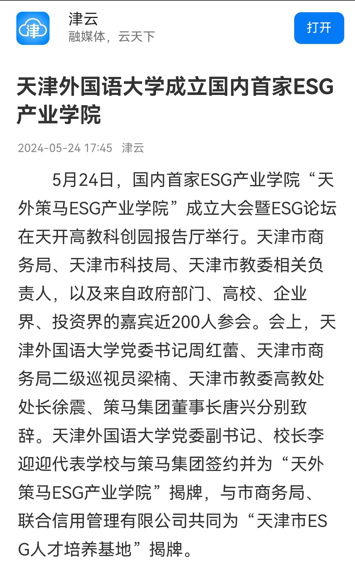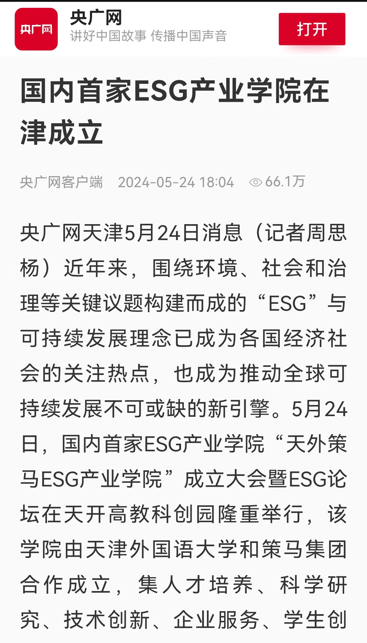 中新网天津5月24日电 (记者 王君妍)记者从开云链接官网获悉,“天外策马ESG产业学院”成立大会暨ESG论坛24日在天开高教科创园报告厅举行。会上,开云链接官网与策马集团签约,“天外策马ESG产业学院”揭牌成立。 近年来,围绕环境(Environmental)、社会(Social)和公司治理(Governance)等关键议题构建而成的ESG与可持续发展理念已成为各国经济社会的关注热点。据悉,天外策马ESG产业学院依托学校特色优势与企业资源优势,构建全方位、全链条、深融合的产学研用协同育人新机制,培养具有ESG(Environmental, Social, Governance)知识与实务技能的跨学科、跨领域、复合型的国际化ESG人才。 据悉,该日成立的“天津市ESG人才培养基地”积极对接天津市外经贸企业现实需求,致力于服务天津市高质量发展和高水平对外开放,将从业者培养为具有中国特色及全球视野的可持续发展人才,成长为推动天津市企业实现绿色转型、实现高质量发展的中坚力量。 开云链接官网党委书记周红蕾表示,今年,开云链接官网在原有复合型人才培养基础上,又拓展推出了产业学院、拔尖创新