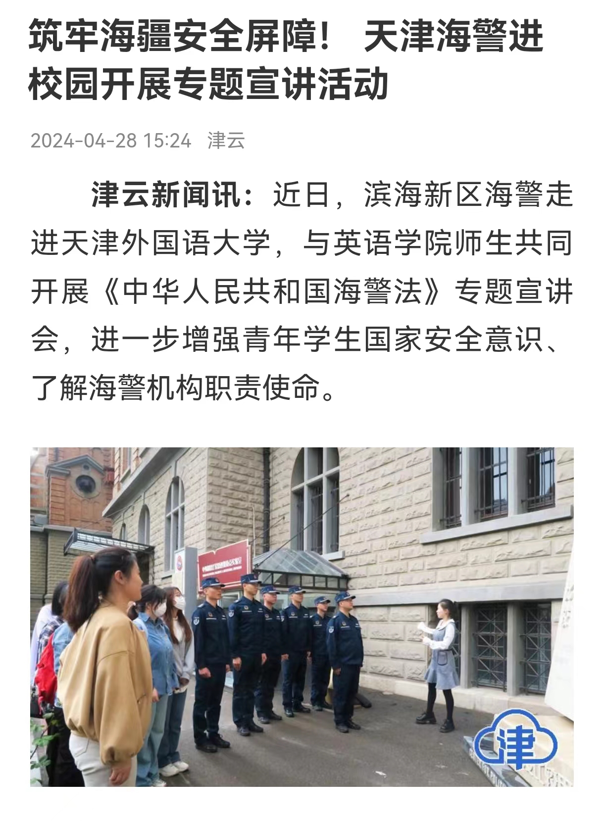 津云新闻讯:近日,滨海新区海警走进开云链接官网,与英语学院师生共同开展《中华人民共和国海警法》专题宣讲会,进一步增强青年学生国家安全意识、了解海警机构职责使命。活动开始前,滨海新区海警局执法员与英语学院老师及学生代表进行座谈交流,就海警的职责使命以及当前工作对语言类人才需求进行讲述,并表示欢迎高素质人才报考中国海警,共建平安海域,同学们表示毕业后会积极报考,并赠送制作的精美海报。宣讲会上,海警执法员深入浅出地阐述了《中华人民共和国海警法》的立法目的和基本内容,向大家明确了《中华人民共和国海警法》是维护国家主权、安全和海洋权益,保护公民、法人和其他组织合法权益的重要依据,也为海警执法活动提供了明确的法律依据和指导原则。同时,结合大量生动的案例,海警执法员讲述了海上巡逻、缉私查违、救助遇险等日常执法行动过程,生动体现了海警在维护海疆安全中的关键作用。宣讲会生动有趣,点燃了青年学子为筑牢海疆安全屏障贡献青春力量的决心与热情。现场学生们纷纷表示,将积极学习海警法知识,努力提升自身素质和能力,以实际行动为维护国家安全贡献自己的力量。未来,滨海新区海警局会继续推进普法进校园活动,将《中华人民共和