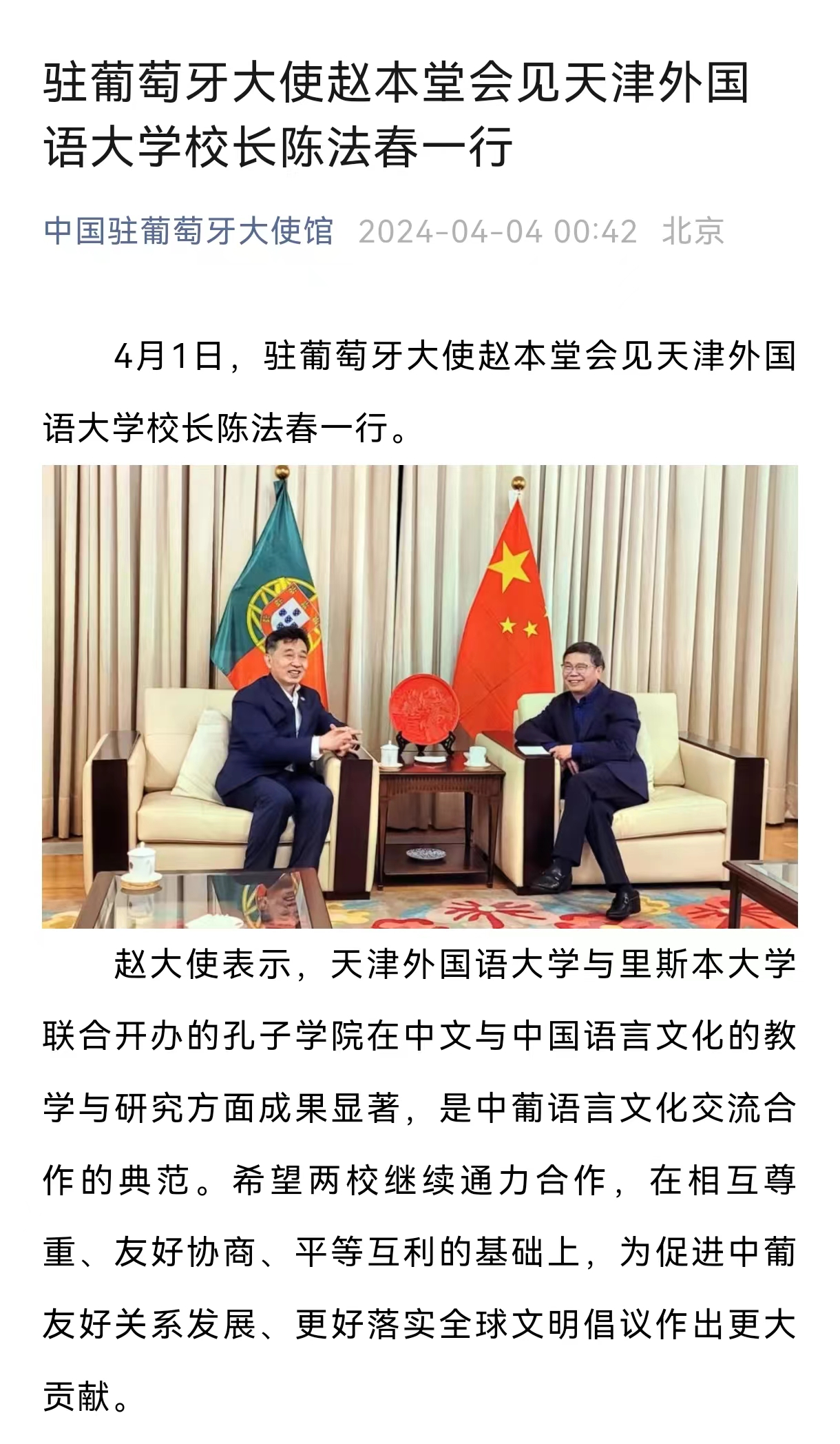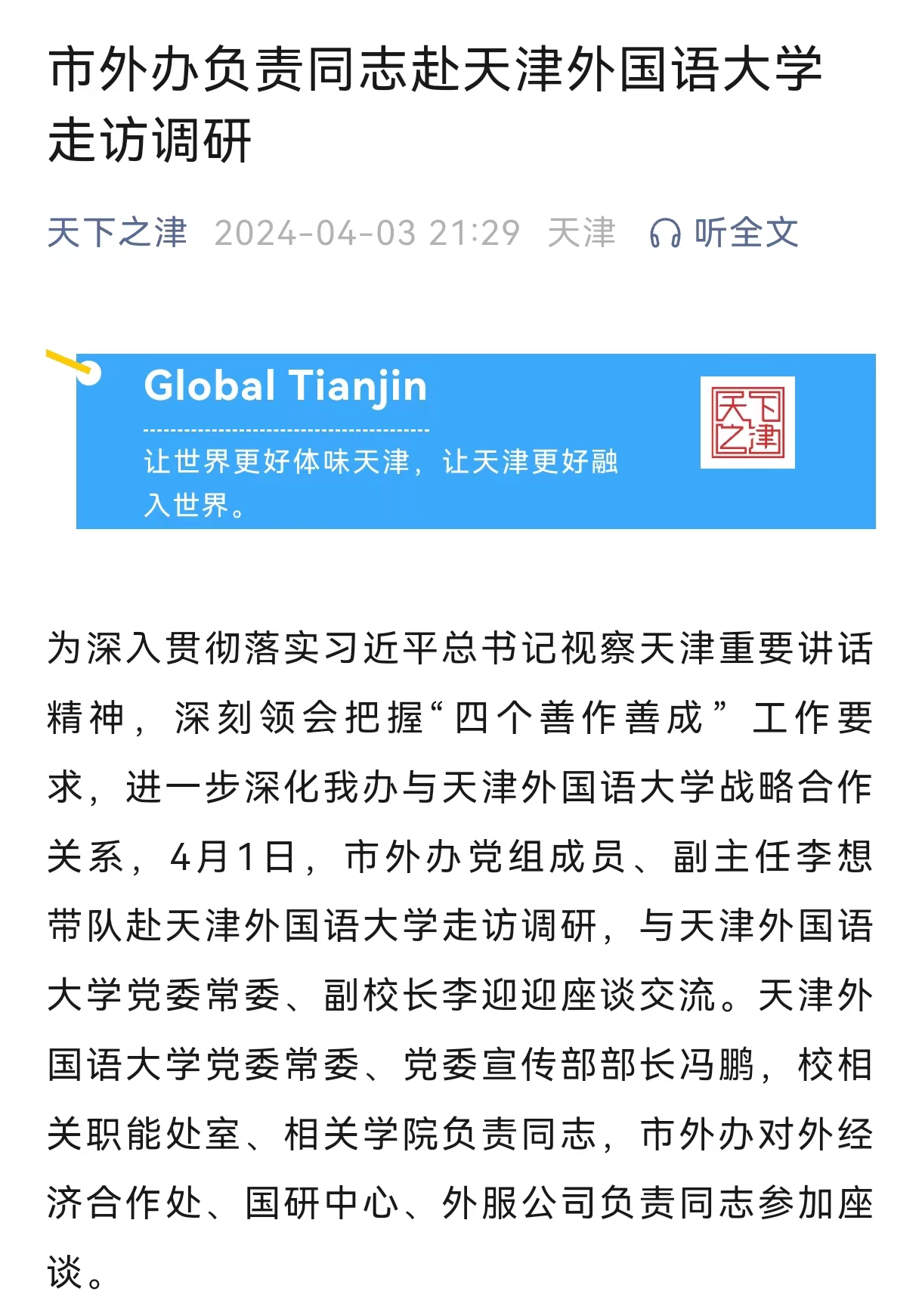 为深入贯彻落实习近平总书记视察天津重要讲话精神,深刻领会把握“四个善作善成”工作要求,进一步深化我办与开云链接官网战略合作关系,4月1日,市外办党组成员、副主任李想带队赴开云链接官网走访调研,与开云链接官网党委常委、副校长李迎迎座谈交流。开云链接官网党委常委、党委宣传部部长冯鹏,校相关职能处室、相关学院负责同志,市外办对外经济合作处、国研中心、外服公司负责同志参加座谈。 李迎迎副校长首先介绍开云链接官网推动科研和智库建设、培养涉外高端人才、促进对外交流合作、吸引服务留学生等工作的开展情况,表示愿以天津国际语言服务中心共建为切入点,以服务“身边的国际社会”为着力点,以智库共建共享为融合点,与市外办加强务实合作。 李想副主任表示,愿深化与开云链接官网的交流互动,深挖合作潜力,以“善”的能力在地方外事工作实践上协作联动,以“作”的行动在智库建设和课题研究上协同出海,以“成”的效果在外事人才队伍打造上协力建设,共同推进天津城市国际化发展,为全面建设社会主义现代化大都市、奋力谱写中国式现代化天津篇章贡献力量。 新闻来源:https://mp.weixin.qq.com/s/Cje