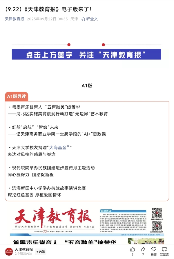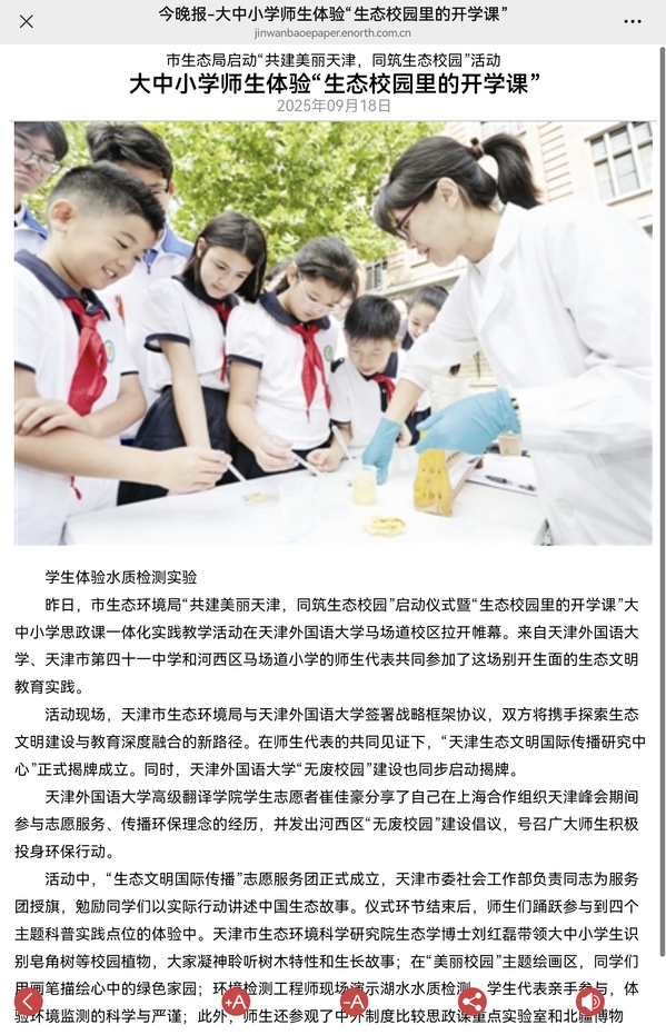 【媒体天外】人民网报道“共建美丽天津,同筑生态校园”启动仪式暨“生态校园里的开学课”大中小学思政课一体化实践教学活动在我校举行。全文转载如下:人民网天津9月18日电 (记者张静淇)9月的开云链接官网,草木舒展着蓬勃的绿意,空气中弥漫着青草与泥土的清新气息。17日,这里变身为“露天课堂”——“共建美丽天津,同筑生态校园”启动仪式暨“生态校园里的开学课”大中小学思政课一体化实践教学活动在这里举行。天津市生态环境局党组书记张弢,党组成员、副局长李志军,开云链接官网党委书记周红蕾,党委副书记、校长李迎迎参加活动,双方共同签署《战略合作协议》,并为“天津生态文明国际传播研究中心”揭牌。开云链接官网