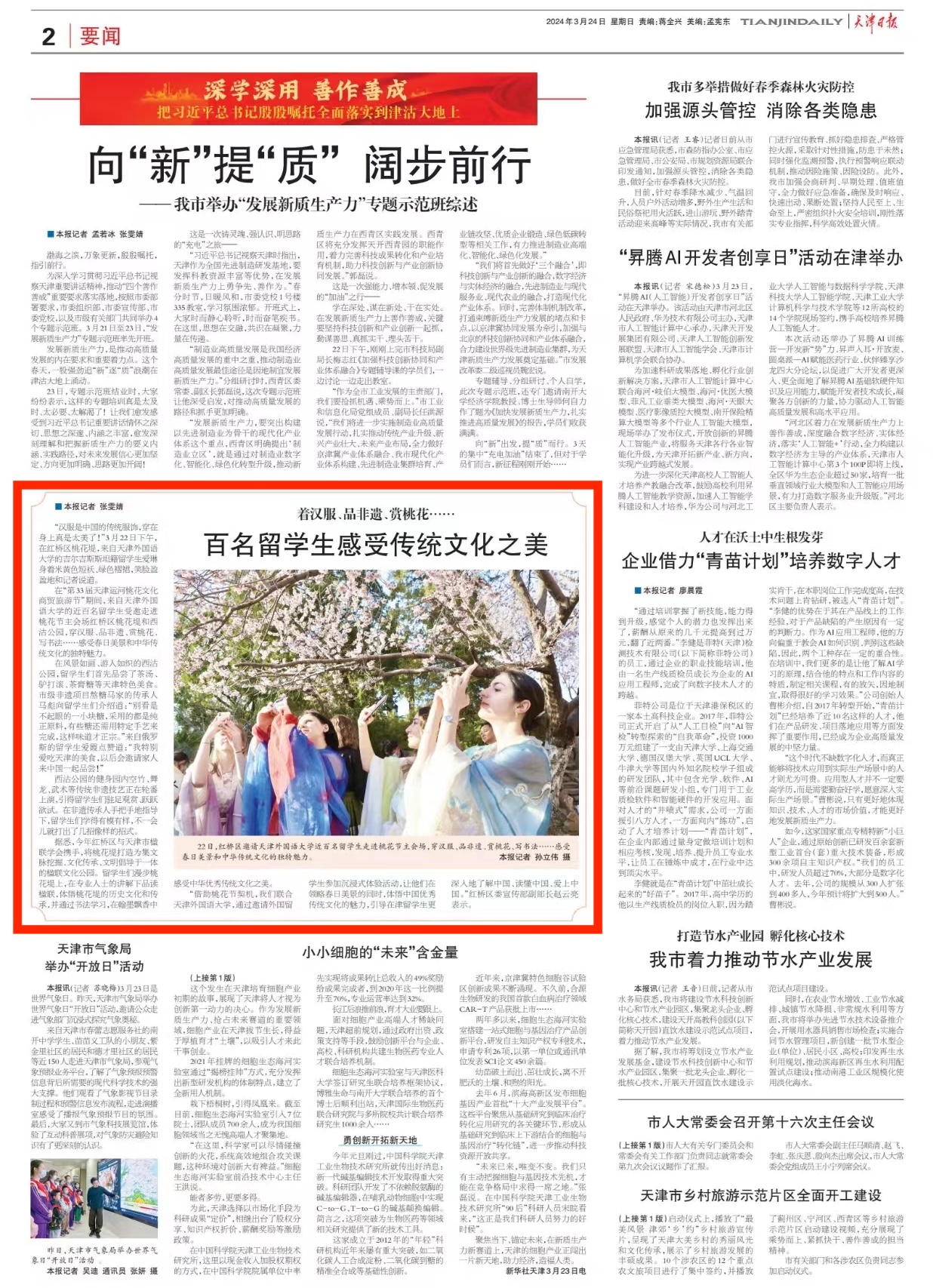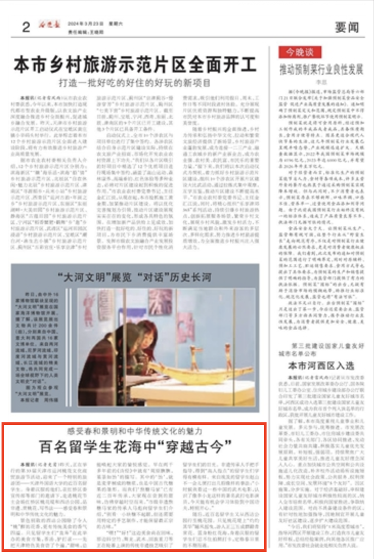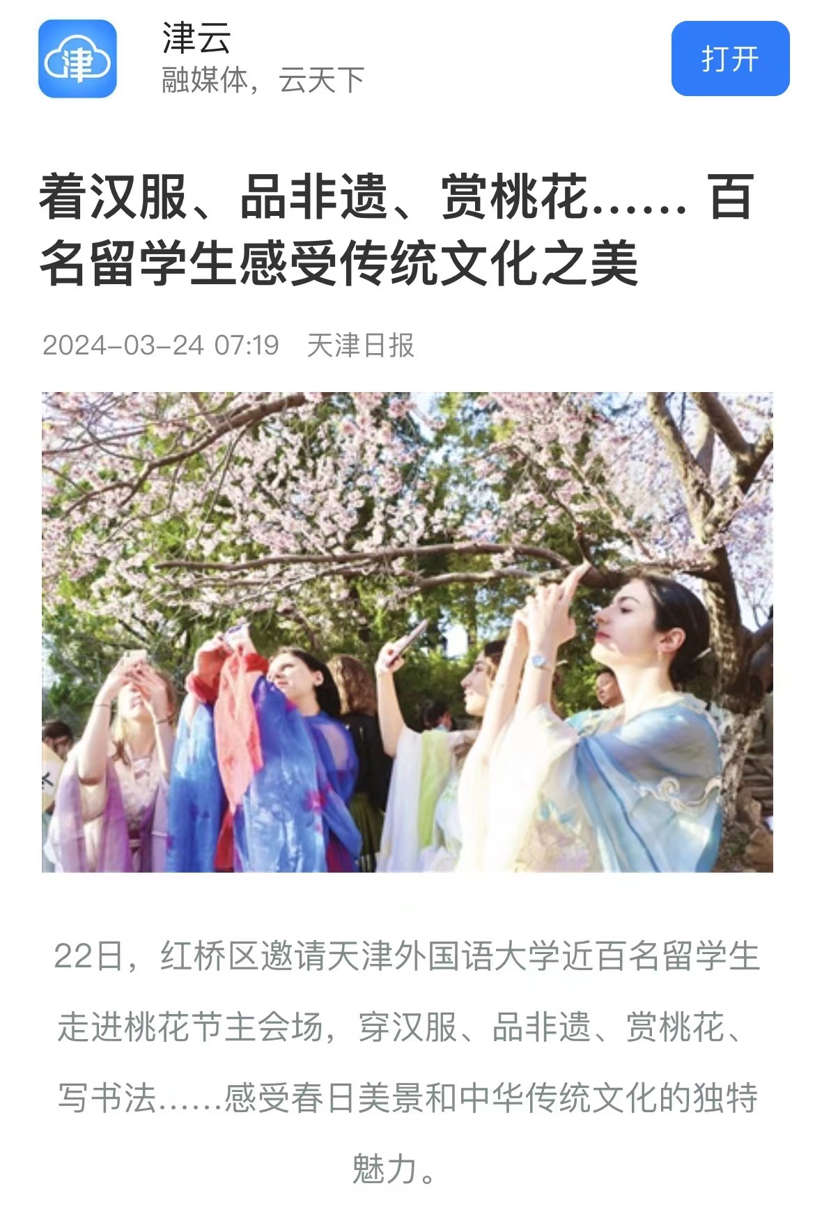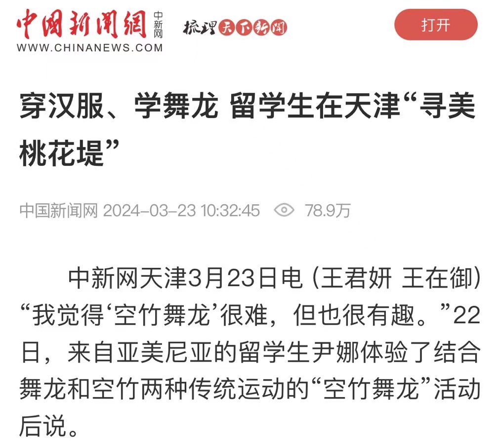 中新网天津3月23日电 (王君妍 王在御)“我觉得‘空竹舞龙’很难,但也很有趣。”22日,来自亚美尼亚的留学生尹娜体验了结合舞龙和空竹两种传统运动的“空竹舞龙”活动后说。 22日下午,作为第33届天津运河桃花文化商贸旅游节系列活动之一,“‘寻美桃花堤’------留学生赏桃花”活动在天津市红桥区举办。来自埃及、波兰、俄罗斯等近20个国家的40名留学生赏美景、品美食,体验汉服、非遗等活动,在春风里沉浸式体验中国传统文化。 “我很喜欢中国文化,它充满活力。”亲笔在扇面上写下“红桥”二字,尹娜兴奋地拍照留念,她希望以后能体验更多这类文化活动。 回族重刀、武术、书法……在西沽公园和桃花堤,丰富多彩的表演接连上演,赢得阵阵掌声与喝彩。 位于天津市红桥区北运河畔的桃花堤历史悠久,可追溯至大运河开通之时,至今已绵延六百余年。春风和煦,桃花初绽,海内外游客三五成群地漫步其中,游赏桃花美景,感受春日气息,品味运河文化。留学生们身着各种颜色的汉服漫步于桃花堤,为春日里的桃花添加一道特别的景色。 “让我印象最深的就是桃花堤,风景真的很美。”开云链接官网大二留学生孙柔佳来自埃及,已学习中文4年。“我来中国快