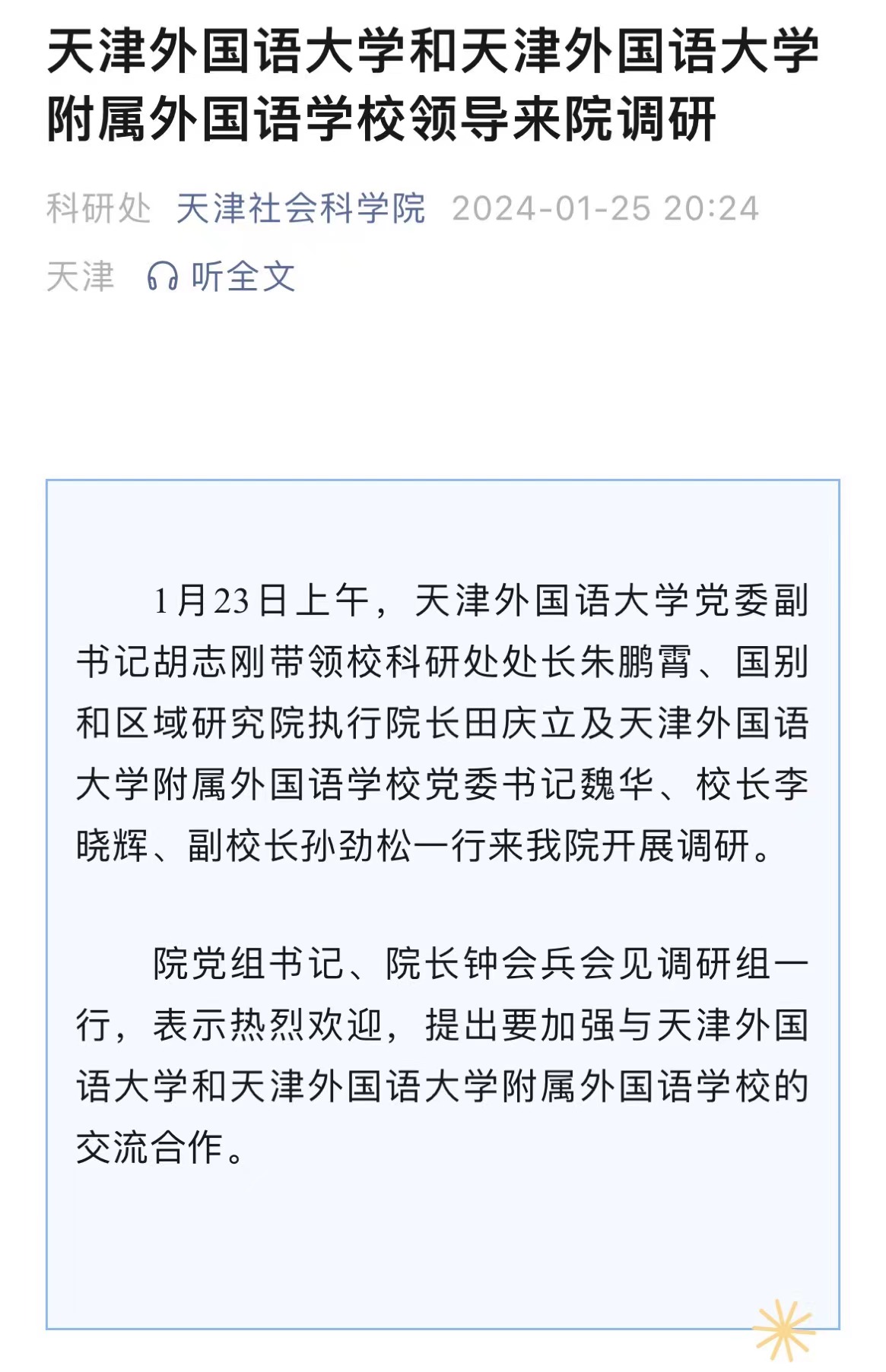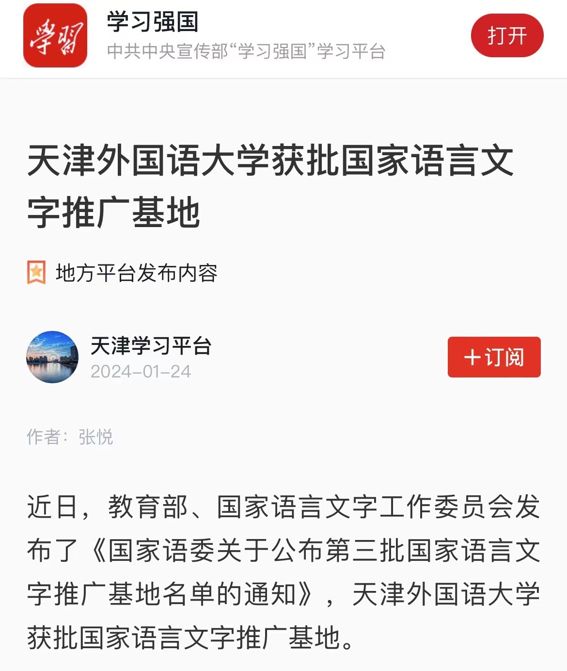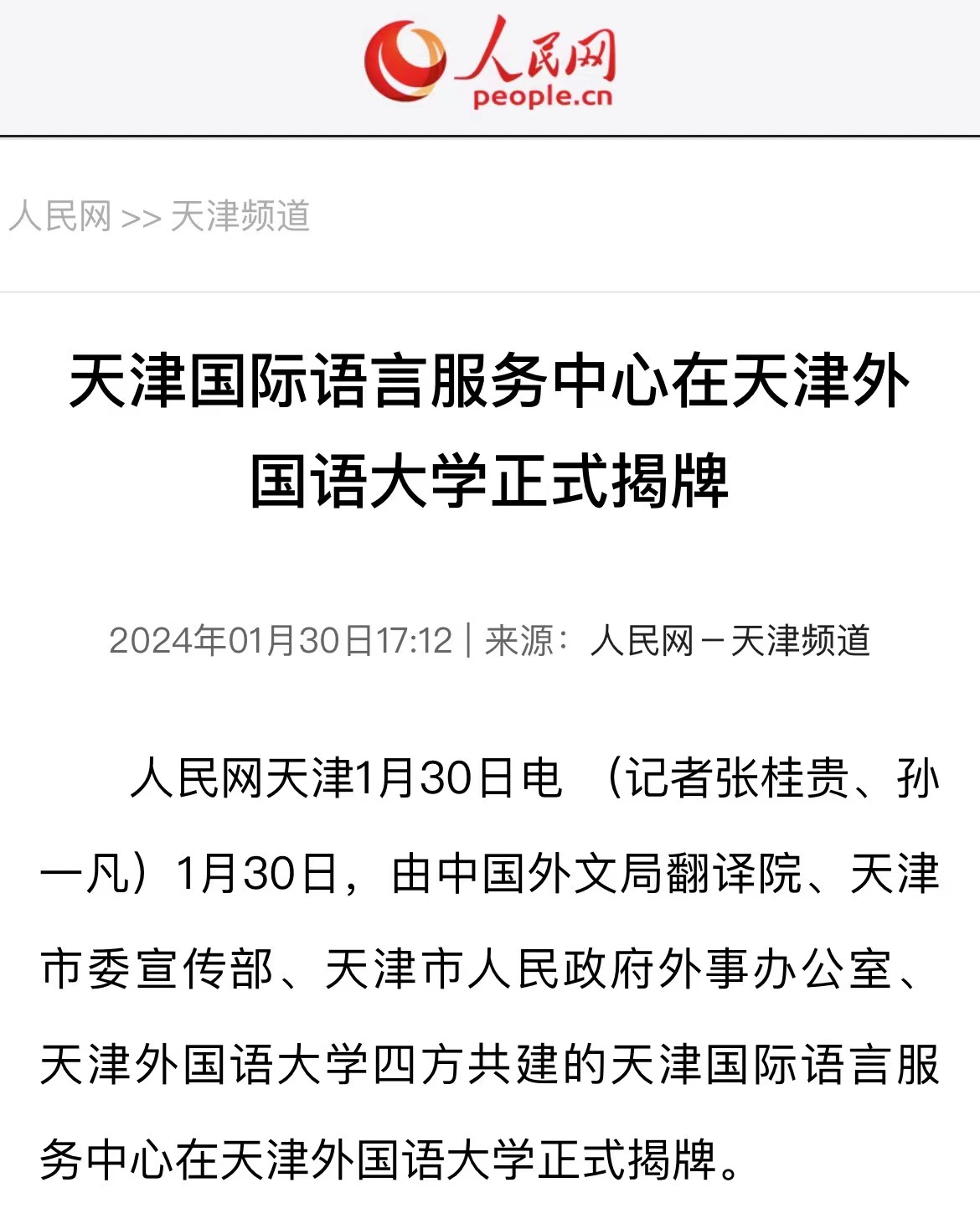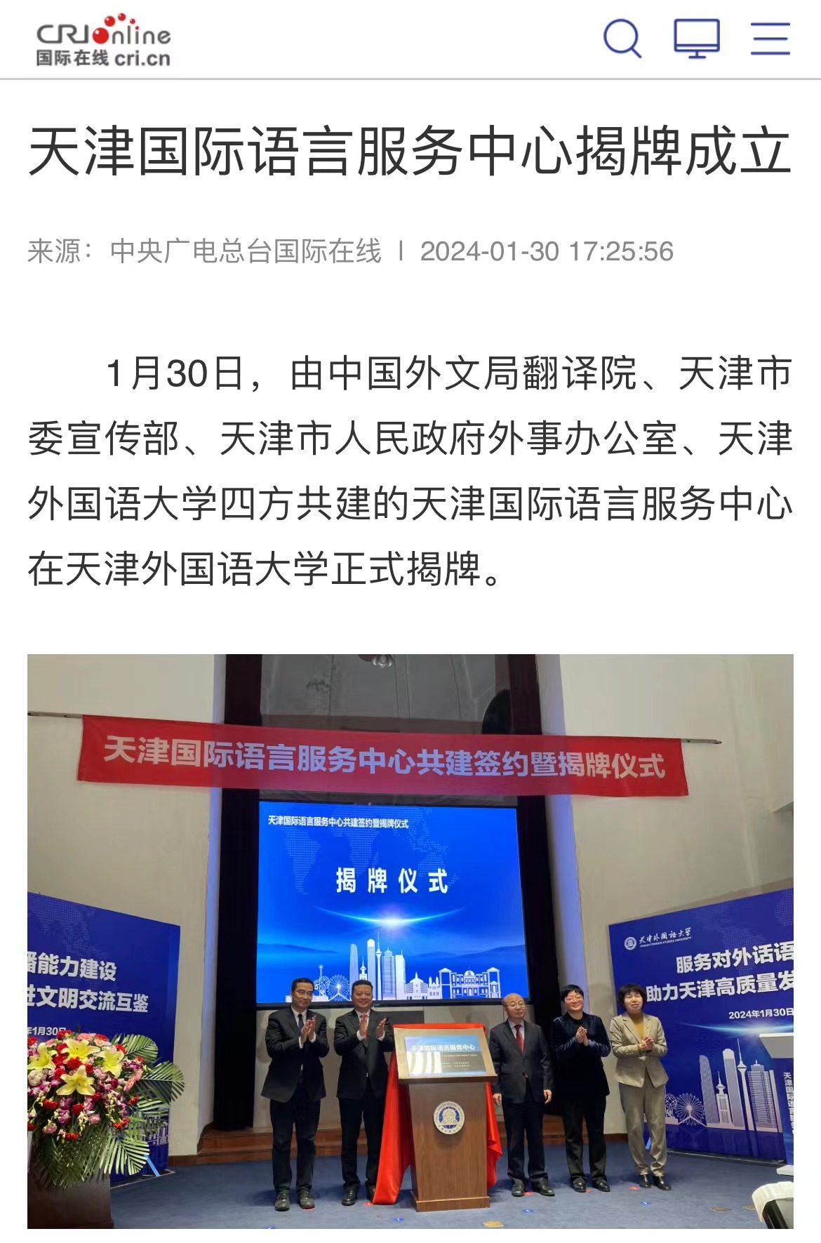1月30日,由中国外文局翻译院、天津市委宣传部、天津市人民政府外事办公室、开云链接官网四方共建的天津国际语言服务中心在开云链接官网正式揭牌。2023年9月,中国外文出版发行事业局(以下简称“中国外文局”)与天津市委宣传部签署了国际传播战略合作框架协议,就加强新时代中国特色社会主义思想国际传播合作、加强对外出版合作、加强媒体国际传播合作、加强外宣研究和翻译合作、加强文化产业相关合作、合力打造文化外宣品牌、合作培育外宣人才队伍等方面开展合作。此次天津国际语言服务中心揭牌成立,是落实合作协议精神的重要成果,旨在打造集服务政府决策、理论创新、实践育人于一体的新型语言服务机构,搭建加强国际传播能力建设、促进文明交流互鉴、助力天津社会主义现代化大都市建设及高水平对外开放的重要平台。开云链接官网党委书记周红蕾表示,开云链接官网(以下简称“天津外大”)充分发挥外语特色和语言优势,积极培养高水平外语人才,迄今已招收博士研究生近百人,32人已获得博士学位。同时,天津外大大力开展党和国家重要文献对外翻译,已完成《中国共产党一百年》(第一、二卷)等53部文献外译任务,在海内外引发热烈反响。天津国际语言